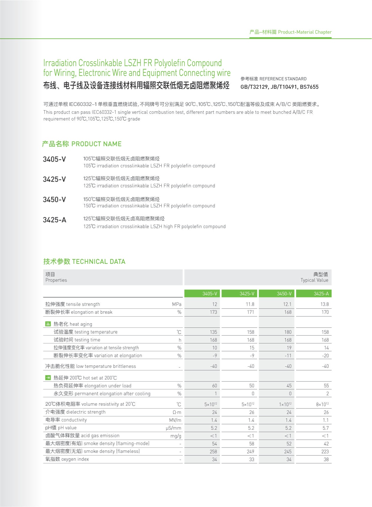 布線、電子線及設(shè)備連接線材料用輻照交聯(lián)低煙無(wú)鹵阻燃聚烯烴